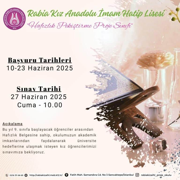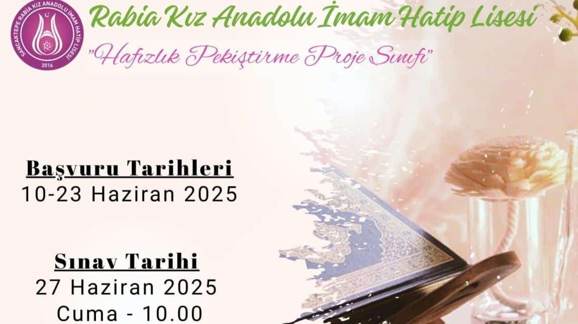 Hafızlık Pekiştirme Proje Sınıfı başvuruları 10-23 Haziran 2025 tarihleri arasında e-okul ya da okula gelerek yapılacaktır.